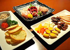 焼鶏以外の豊富な一品料理もぜひご賞味ください。素材そのものの味をご堪能いただける「刺身盛り合わせ」、ワインとのマリアージュが絶品の「レバーペースト ガーリックトースト添え」「自家製くんせい」、さらに、季節ならではのお料理を、お通しや一品料理としてご提供いたします。お客さまの舌を飽きさせないよう、旬の食材を揃えてお待ちしております。
